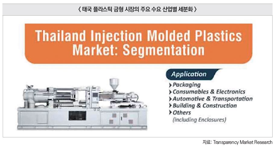 - 태국 플라스틱 금형 시장은 자동차, 전자, 포장, 헬스케어, 소비재 등 다양한 산업에서 활용되며,