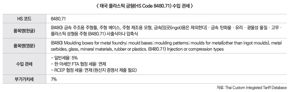 태국 관세청에 따르면, HS 코드 8480.71에 해당하는 사출 또는 압축 성형용 플라스틱 금형은 태국 수입 시 일반세율 5%가 적용되며, 한-아세안 FTA 또는 RCEP 협정 세율을 활용할 경우 관세가 면제된다(단, RCEP 적용 시 원산지 증명서 제출 필요). 이 품목은 기계류에 해당하므로 통관 시 별도의 인증이나 수입허가는 요구되지 않으며, 일반적인 수입 서류(상업송장, 포장명세서 등)를 준비하면 통관이 가능하다. 또한, 태국에서 수입 부가가치세(VAT)는 7%가 적용된다.