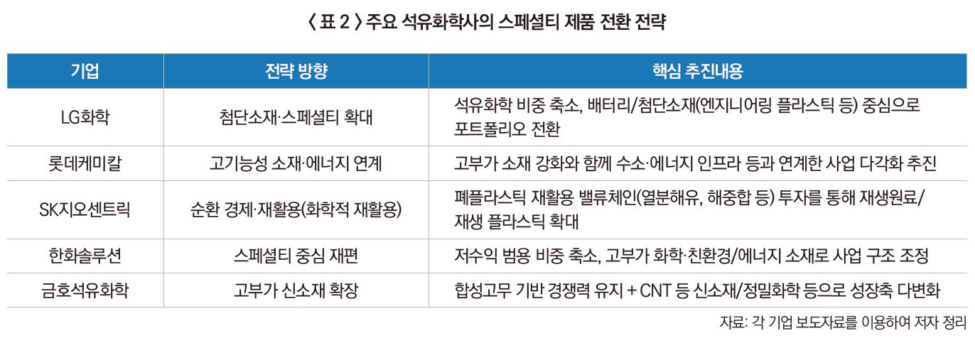 특히 대기업들이 개별적으로 추진 중인 배터리 소재나 탄소섬유 사업을 국가전략산업 차원에서 육성하고, 정밀화학 및 제약·바이오와 연계된 밸류체인을 구축하여 기존 인프라가 신산업의 토대가 되도록 유도해야 한다. 이를 위해서는 인허가 절차 간소화와 같은 규제 개선이 선행되어야 하며, 민간의 투자 리스크를 덜어줄 성장 펀드 조성도 필수적이다.