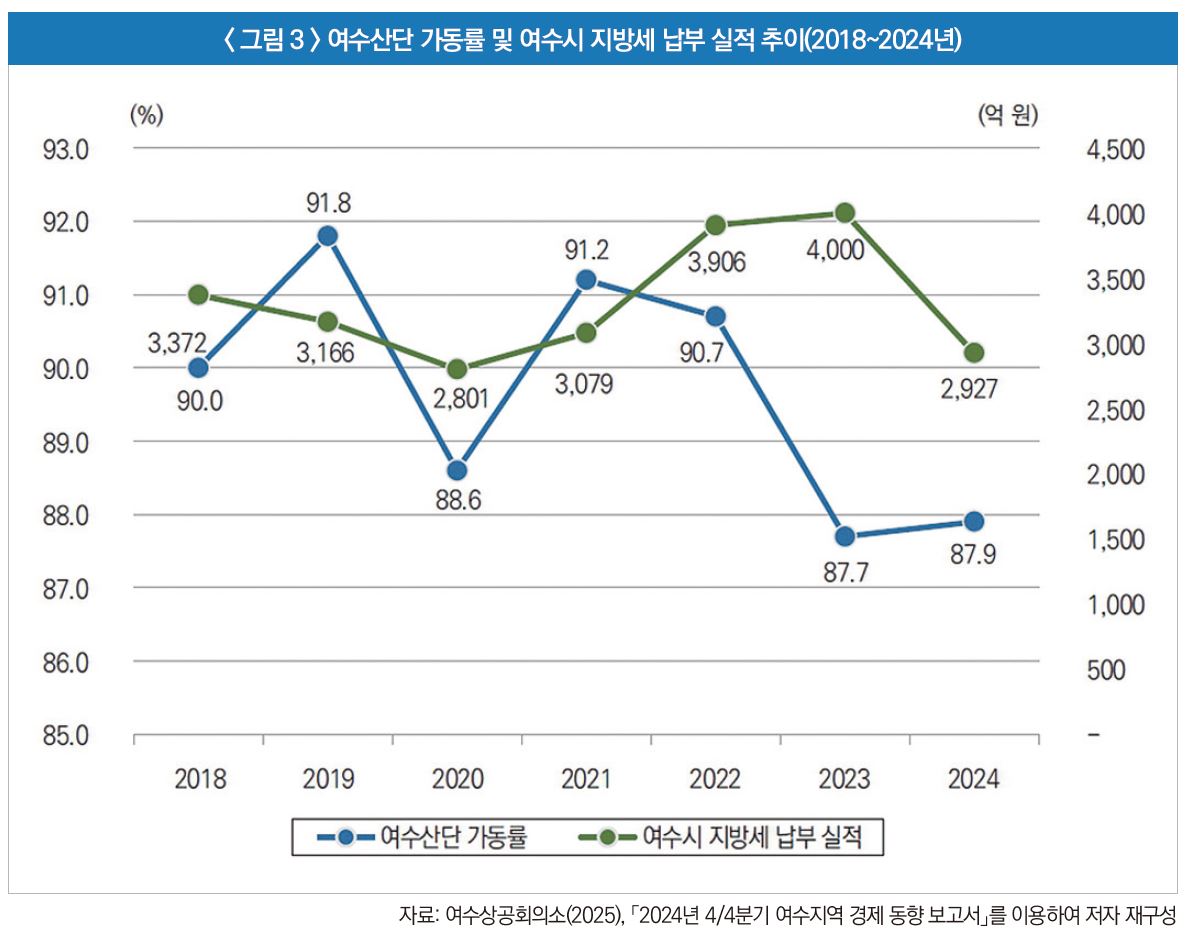 이와 같은 산업 여건 악화는 여수 지역경제 전반에 직접적인 영향을 미치고 있다. 여수산단 의 가동률은 2021년 91.2%에서 2023~2024년 87%대로 하락했으며, 생산 실적도 2022년 101조 7,000억 원에서 2024년 87조 8,000억 원으로 감소했다. 이에 따라 여수산단을 중심으로 한 지역 경제활동이 위축되면서, 여수시는 세수 감소와 기업 경영 악화에 따른 재정 압박에 직면하고 있으며, 협력업체 도산 우려 등 지역경제 불안 요인이 확대되고 있다.