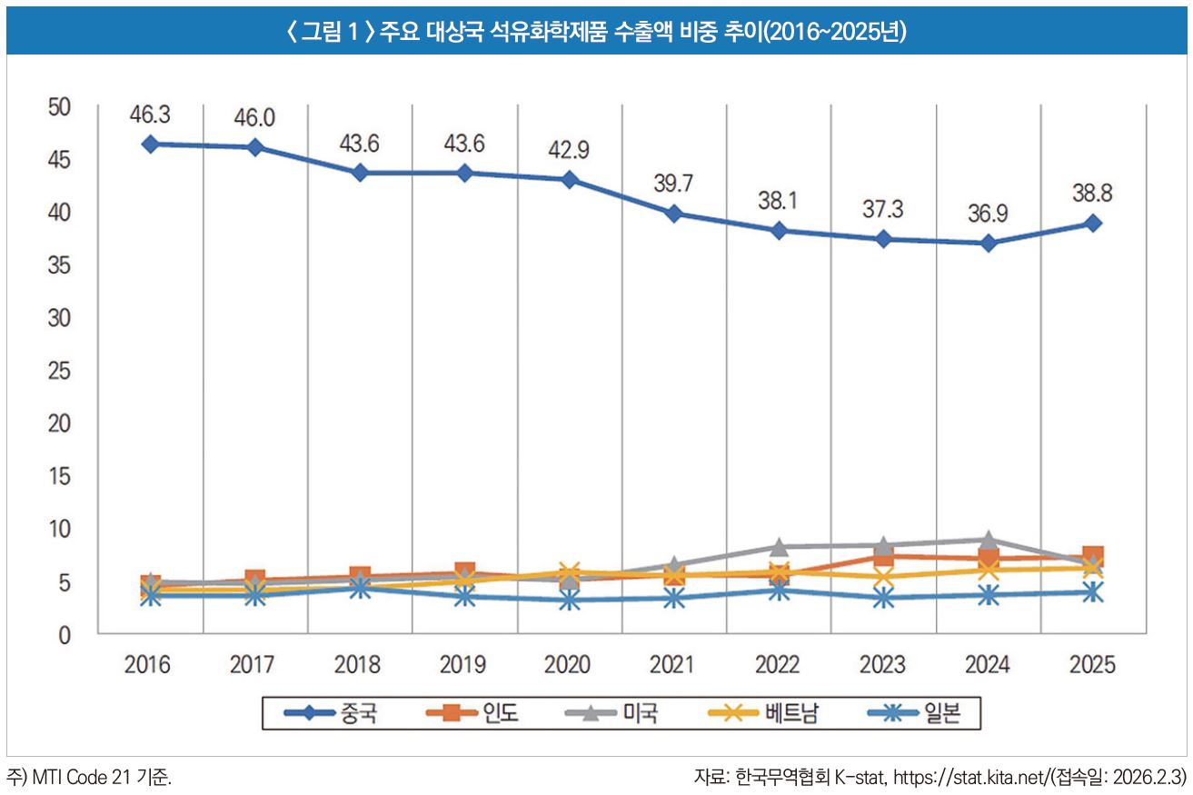 <그림 1>과 같이 국내 석유화학제품 수출에서 대중국 비중은 2016년 46.3%에서 2025년 38.8%로 감소했다. 중국이 자체 생산으로 대부분 수요를 충당하면서 한국 제품에 대한 수입 수요가 급감한 결과이다. 이에 한국 기업들은 대체 수출시장 확보에 어려움을 겪고 있으며, 일본, 동남아 등 다른 시장에서도 글로벌 경쟁 심화로 수출 여건이 악화되고 있다.