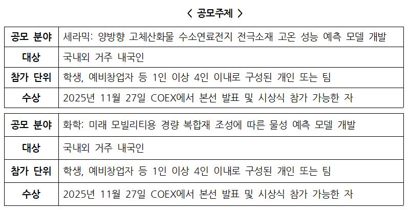 이번 대회는 화학 및 세라믹 소재 분야의 실험·연구 데이터를 기반으로, 국내외 학생과 연구자들이 AI를 활용하여 산업 현장의 문제 해결 능력을 겨룰 수 있는 자리이다.